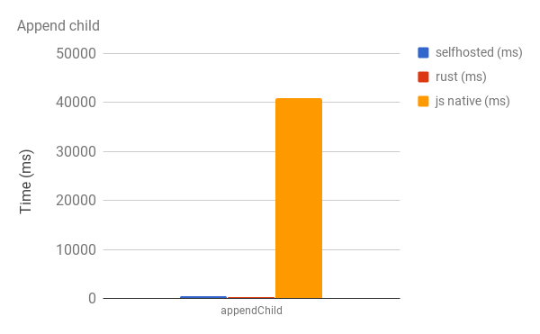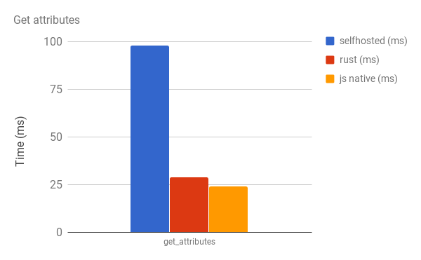 Selfhosted method performs pretty poor. In this method, the attr array is implemented using Vec for Rust type and JSArrayObject for JavaScript type. For this method, the cost of VM call from the JavaScript side to native side is amortized by the fast native implementation.