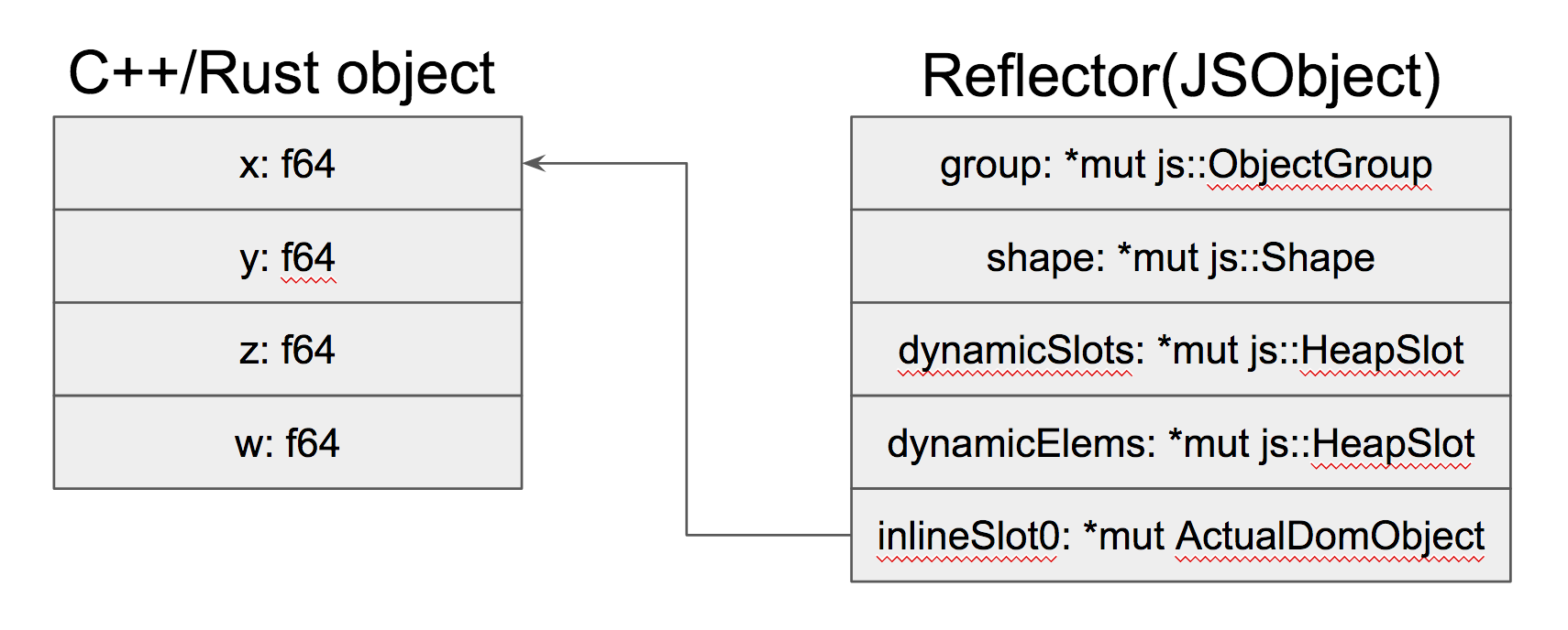 DOM is the API that allows JavaScript to interact with HTML documents. The object that is a part of the DOM API is usually implemented as heap allocated C++/Rust object for most browsers. For JavaScript to interact with these objects, it needs to go through a wrapper called a reflector that gives JavaScript code access to the DOM object. For example, the DOM objects and reflectors on Servo is shown in Figure 1.
