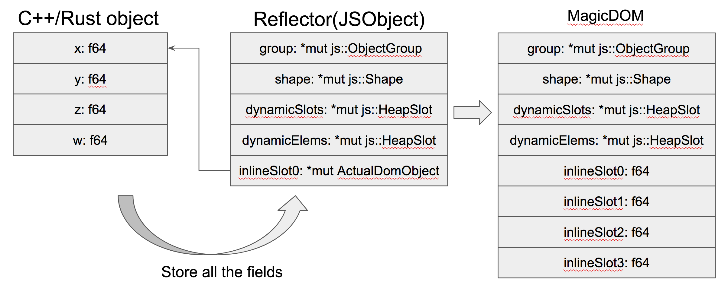Based on the observation, instead of storing the fields of DOM in a separate heap allocated object, MagicDOM stores all of the fields in the reflector (Figure 2).
